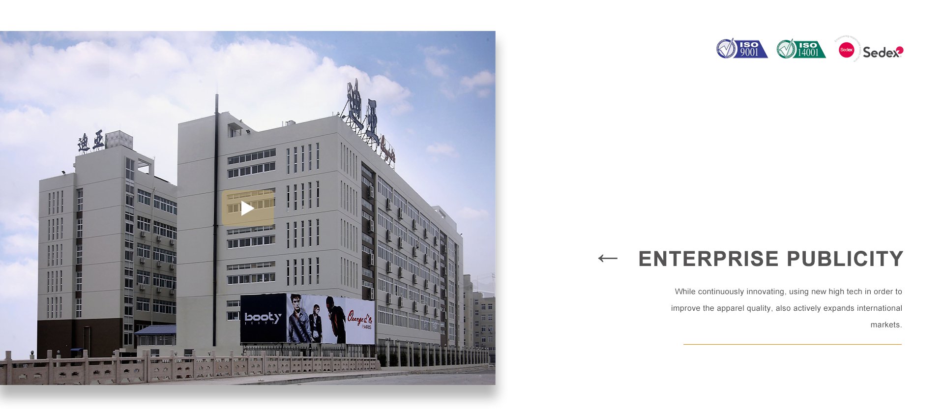 浙江迪亞服飾有限公司于1998年在世界時(shí)尚品牌之都——法國(guó)巴黎二區(qū)應(yīng)運(yùn)而生。同年,在浙江省甌海經(jīng)濟(jì)開(kāi)發(fā)區(qū)東方南路28號(hào)設(shè)立服裝制造工廠(chǎng)。公司集服裝設(shè)計(jì)、生產(chǎn)、營(yíng)銷(xiāo)、品牌于一體,在不斷創(chuàng)新、采用高新技術(shù)提高服飾質(zhì)量的同時(shí),積極拓展國(guó)際市場(chǎng),海外營(yíng)銷(xiāo)部長(zhǎng)期與LV集團(tuán)旗下的MAJE、SOEUR、BALIBARIS等國(guó)際著名品牌保持非常緊密的合作關(guān)系。品牌建設(shè)是公司堅(jiān)持不懈的追求,我們每年都會(huì)積極參加國(guó)內(nèi)外舉辦的各大服裝展銷(xiāo)會(huì)。憑借著良好的質(zhì)量與信譽(yù),市場(chǎng)占有率在逐漸擴(kuò)大,產(chǎn)品遠(yuǎn)銷(xiāo)歐洲、美洲、亞洲等國(guó)。公司以生產(chǎn)棉衣、羽絨服、派克、大衣、夾克、運(yùn)動(dòng)休閑服飾等為主,旗下主打品牌有 ORANGE D’OR 、CLAIRVAL、BOOTY JEANS 、S&V和SASAEC,各品牌服飾均以典雅的色彩、優(yōu)美的線(xiàn)條、卓越的魅力吸引著都市麗人,將時(shí)尚、經(jīng)典的潮流信息予以淋漓盡致的演繹。